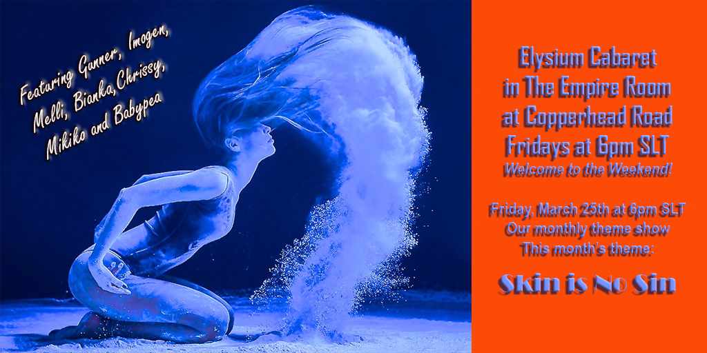 If it’s Friday, it’s Elysium Cabaret! Fancy some imagination in a fun social setting? In The Empire Room at Copperhead Road, every Friday at 6pm SLT, the dynamic performers of Elysium Cabaret take the stage to bring you a solid hour of entertainment! Featuring elaborate sets, stunning costumes and choreography sequenced to an eclectic genre of music, Elysium Cabaret offers something for everyone.